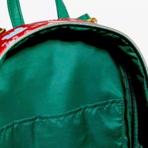 This mini backpack has an allover Mickey Mouse-inspired print of ornaments, stockings, presents, peppermint candies, hot beverages & wreaths. Adjustable straps & interior pocket.