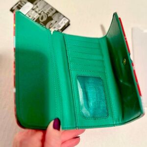 This mini flap wallet showing an allover Mickey Mouse-inspired print of ornaments, stockings, presents. The interior has card & cash slots plus a clear ID display.