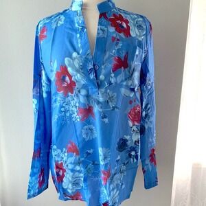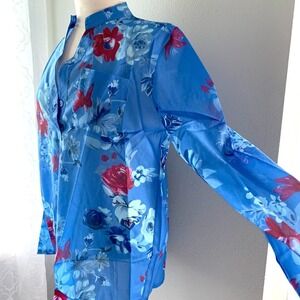 Pretty blue floral boho style top. Has V neck opening with button closure and breast pocket. Material is a cotton/poly blend. The sleeves can be worn long or can be rolled up and buttoned creating versatility. Material is a cotton/poly blend.