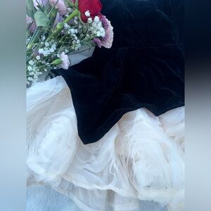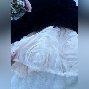 Elegant Black Velvet & Rosette Mini Dress brand new with tags. Strapless black velvet bodice with dramatic ivory rosette tulle skirt. Super flattering, structured fit. Perfect for birthdays, bachelorette, holiday parties, Vegas, or special events. Size Medium.