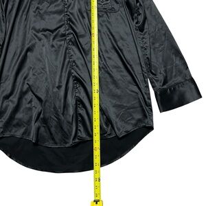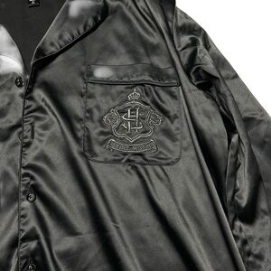 The Skims Hotel Satin Sleepdress in size small is a luxurious and comfortable sleepwear option for women. Made from a blend of polyester and spandex, the dress features a solid black color with a collared neckline and long sleeves, making it perfect for all seasons. The satin fabric adds a touch of elegance, while the button closure and embroidered logo accents provide a stylish finish. With a lightweight design, this sleepshirt is not only fashionable but also practical for lounging at home.