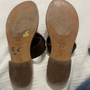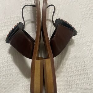 Gently used beautiful leather sandals with orange stones, some wear on soles