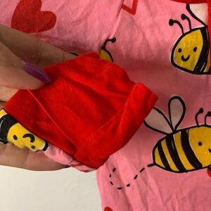 Adorable footie featuring bees and hearts. Red trim adds a fun contrast.