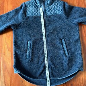 Cozy navy Sherpa jacket with quilted accents. Full zip closure. Perfect for layering.