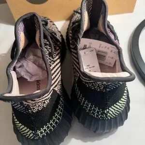 Stylish Yeezy Boost 350 V2 sneakers. Features black and red knit design. Comfortable and trendy. With box