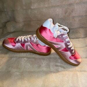 Elevate your look with these satin sneakers. Features a pink and white design. Comfortable and stylish for everyday wear. These are gorgeous.