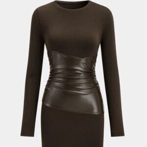 NWT Commense PU Leather Panel Long Sleeve Mini Dress Brown XS Bodycon