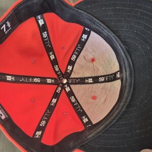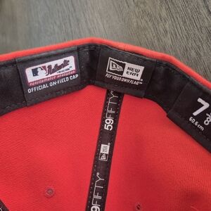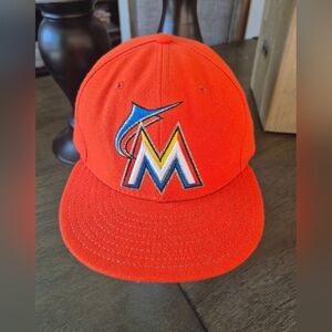 This is a New Era MLB Miami Marlins 59FIFTY Official On Field baseball cap in orange, size 7 5/8. Blokecore style with a lightweight and breathable design, suitable for summer, fall, and spring. The cap has a vintage look and is themed around the Miami Marlins team, ideal for casual wear or travel. Its design appeals to fans of sports, streetwear, hip hop, and classic styles.