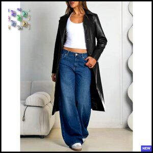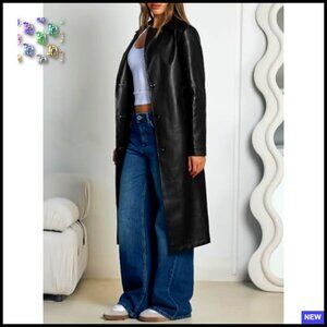 Long Faux Leather Trench Coat Classic Elegant Chic Open Front Belted