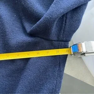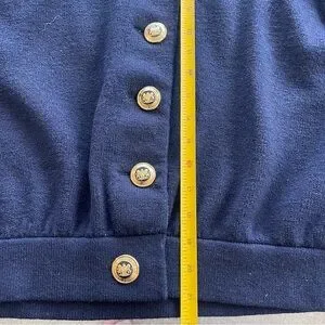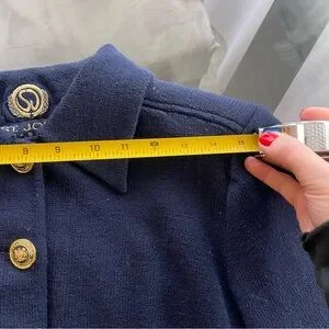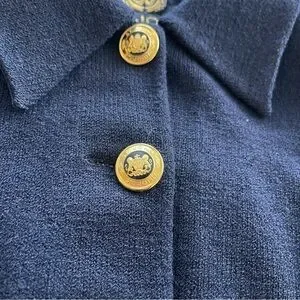 The St. John Cardigan is a luxurious navy blue Santana knit sweater designed for women in size Large. This 3/4 sleeve cardigan features a collared neckline, button accents, and a relaxed fit, making it perfect for various occasions such as travel, parties, casual outings, and business meetings. The lightweight sweater is crafted from knit fabric and includes pockets for added convenience. With its designer brand and nautical theme, this cardigan is a stylish and versatile addition to any woman's wardrobe.