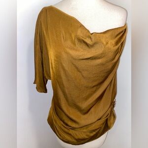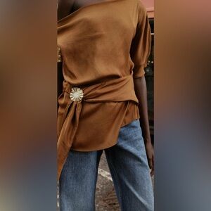 ZARA Asymmetric satin effect off-shoulder bronze top with appliqué top with flowy neckline design. Perfect for casual or an be dressed up. Pullover style. Size M - NWT.