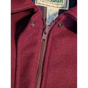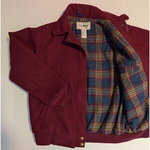 Vintage-inspired bomber jacket crafted from 100% pure wool in a rich burgundy hue. This classic outerwear piece features a cozy plaid flannel lining and Thinsulate insulation for superior warmth. Designed with a full-zip front hidden by a snap-button storm flap, it includes ribbed knit cuffs and hem to seal in heat. Functional details like welt hand pockets and a collared neckline make it a versatile choice for cold-weather layering. Made in the USA, this durable jacket combines timeless style with rugged L.L. Bean quality.