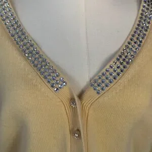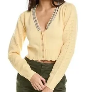 LoveShackFancy Brynner Rhinestone Wool Cashmere Cardigan Sweater in Buttercup Yellow. Size Medium. Features dreamy crystals along the neckline, tiny flower-shaped mother-of-pearl buttons, sweet scallop pointelle detailing at the hem, and trellis-inspired pointelle all over the long sleeves. Fabric: 90% wool and 10% cashmere. Excellent pre-owned condition, all rhinestones in tact. No notable flaws. Retails $595.
