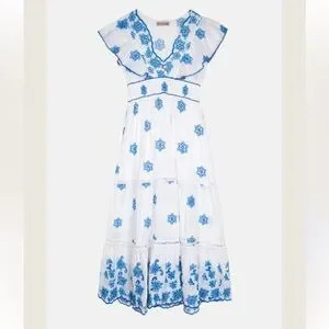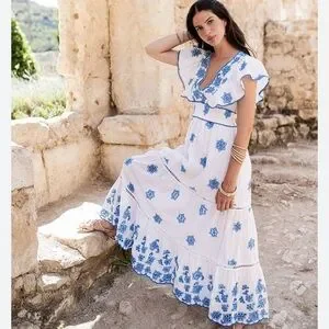 Embrace elegance with this stunning white and blue floral maxi dress. Perfect for any occasion, it features a flowing silhouette and intricate floral patterns. Elevate your wardrobe with this timeless piece.
