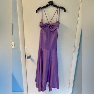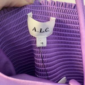 NWT A.L.C. Anita Dress, size 10. Color is listed as Amethyst. Dress/color is beautiful, but this dress does have flaws and is kind of an AS IS. There is a small mark on the front that I think should come out in a dry clean, but the back has marks that I’m not sure will come out. I actually don’t even know what the marks are- they are a little darker than the color of the dress and in some ways, they’re hard to see because the dress is very shiny. I guess what I’m saying is that this is not something that is immediately noticeable and all of the marks like this are on the back part of the skirt. Please see all photos.