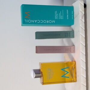 Experience the Moroccanoil treatment set. Features teal, pink, and green packaging. Ideal for hair care enthusiasts.