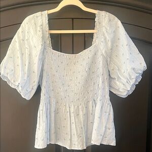 A.N.A. Blue Floral Smocked Puff Sleeve Peplum Blouse