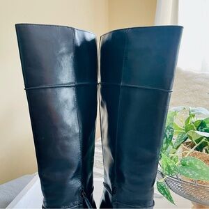 TORY BURCH Linette Smooth Leather Tall Black Wedge Knee High Riding Boots 8.5. Only worn twice! Still in excellent condition with minor wear on sole. Almond toe. Padded footbed. Zipper sides. Cute little seam detail on back of heel. Smoke and pet free home. 4” heel. Stock photo shows styling.