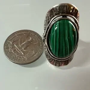 This Passage from Israel ring is a fantastic find. The "Passage" brand is highly regarded for its artisanal, Roman-glass style and organic, hand-sculpted silver work. The deep banded greens of the malachite against that swirling, textured silver make it look like a piece found in an ancient treasure chest.