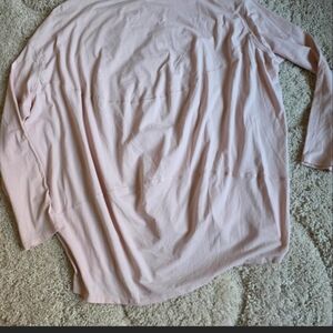 Cozy long sleeve shirt in soft pink. Ideal for everyday comfort. has a small pin hole near the collar. also very light stains in the front. not too noticeable imo. unsure of size. Best for womens medium