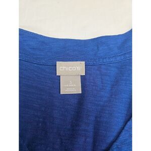Chico's Women's size 3 or XL/16 Solid Blue top with v neckline, 3/4 sleeves, and small side slits. Cotton/Modal fabric blend.