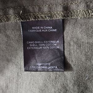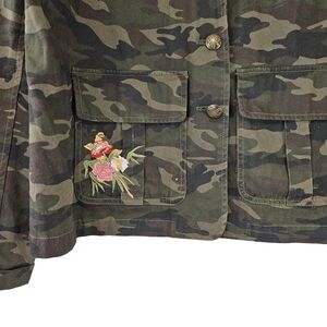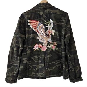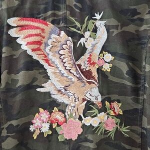 This womens size large camoflauge jacket has embroidered sleeves and back. Eagle embroidery. Collared. 100% cotton.