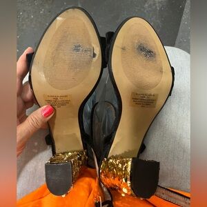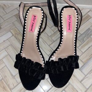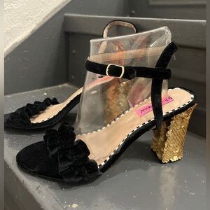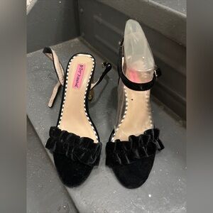 Betsey Johnson Iliana flirty and sexy sequin black ruffle ankle strap heels. Size 7.5 EUC