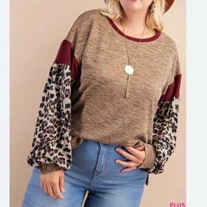 Kori Mocha leopard color-blocked top. Full drop sleeves and multiple textures. Size medium.