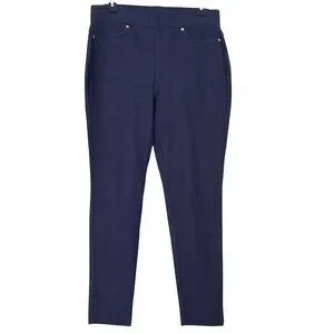 Stylish navy pull-on pants featuring gold-tone accents and a sleek design. Comfortable fit and versatile for casual or semi-formal wear.