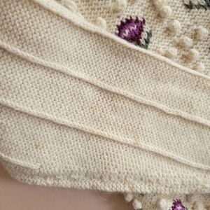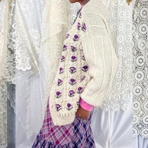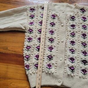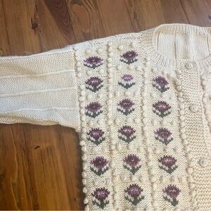 Creamy eggshell vintage cardigan with bobbles and little purple flowers. No tags are present, however it definitely feels as though its wool or a wool blend.