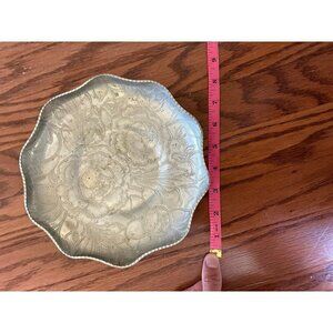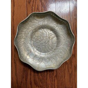 Wilson Specialties Co wrought aluminum floral dish, good condition overall. This is vintage and does show some wear and has some damage but not too bad. Feels like there’s a little wax on floral side but haven’t tried removing.