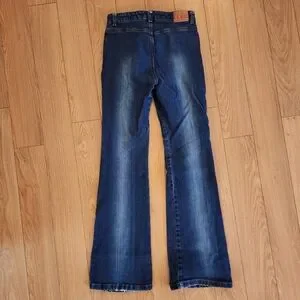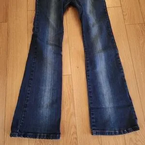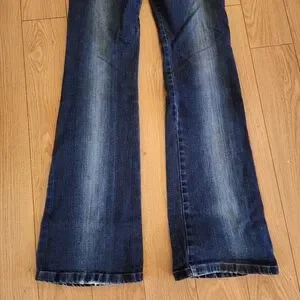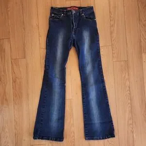 Pre-loved Vintage Guess flare jeans. Size 27, very little stretch. Color is darker denim with fading down the legs. Has front pockets but NO back pockets. Slight "baconing" in the crotch, pictured. Some wear at the back of the ankles per the style. Small stain on the waist that may be paint that might come out with a stain remover, pictured. Mid rise. RN # 62136. Cut # IQ281.