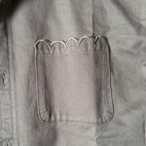 Army Green Chino Cropped Jasper Button Down.Polished details like double fused collar, scalloped side slit, center back box pleat, and long sleeves with cuff and placket for easy roll up, this cropped silhouette is a styling winner!Size M Bust 43' Length 20"Long sleeves with button cuffs Center back box pleat Front button placket Shirttail hem Cropped lengthMaterial: 100% Cotton Care: Machine wash cold with like colors, do not bleach, tumble dry low, cool iron if neededMachine Washable