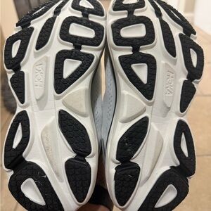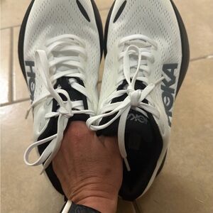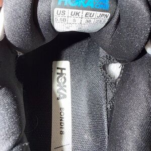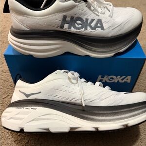 Hoka Bondi 8 shoes in black and white. Designed for comfort and performance.