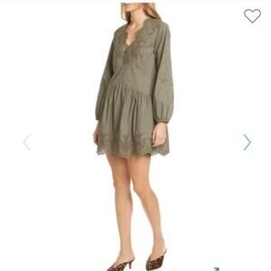 Rebecca Taylor Poplin Dress Olive La Vie Embroidered Large Balloon Sleeve Boho