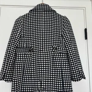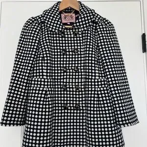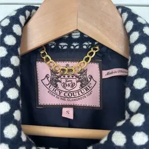 This Juicy Couture wool blend peacoat is a standout mid-2000s Y 2K piece with timeless preppy charm. Crafted in a textured navy and cream polka dot wool blend, it features a structured silhouette, double-breasted front with glossy tortoiseshell buttons, and Juicy's signature gold chain neckline detail. Fully lined and polished yet playful, this coat layers beautifully over denim, dresses, or office wear.