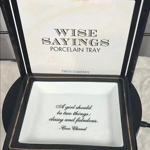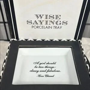 Elevate your home decor with the Wise Sayings Porcelain Tray. This elegant white tray features an inspiring quote from CoCo Chanel! perfect for adding a touch of sophistication to any room.