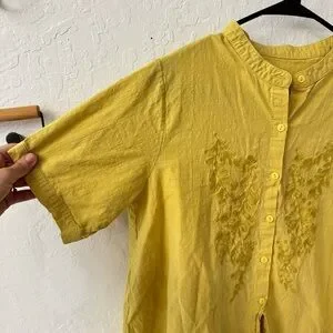 Yellow Linen Cotton Blend Boxy Embroidered Button Down Short Sleeve