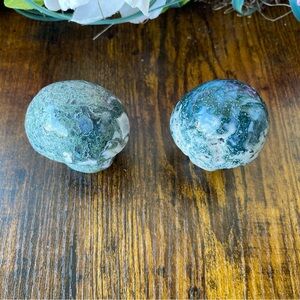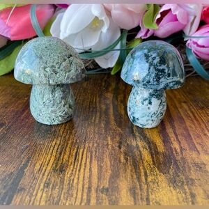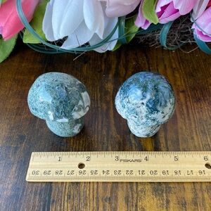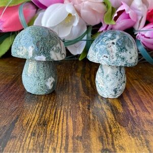 Two medium moss agate mushrooms