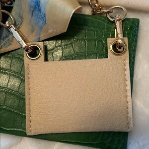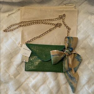 Ann Taylor LOFT in green croc-embossed texture. Includes a chain with credit card envelope to wear as a crossbody! Features a removable scarf accent. Perfect for evenings or daytime wear!