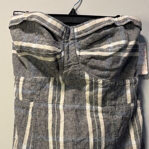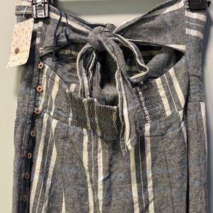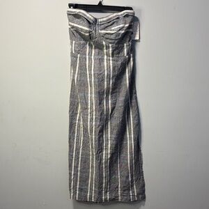 The NWT Free People Linen Cotton Life Like This Midi Dress is a stylish and versatile piece perfect for the summer and spring seasons. Made from a blend of linen and cotton, this dress features a flattering pencil dress style with a striped pattern in a chic gray color. The dress has a button closure and a strapless sleeve design, making it suitable for various occasions, from beach outings to nautical-themed events. With its bohemian and peasant-inspired theme, this Free People dress offers a trendy and effortless look that is sure to become a staple in any woman's wardrobe.