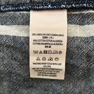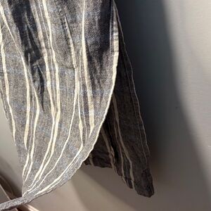 It features a blue and grey plaid pattern with white vertical stripes and is constructed from a lightweight linen and cotton blend.