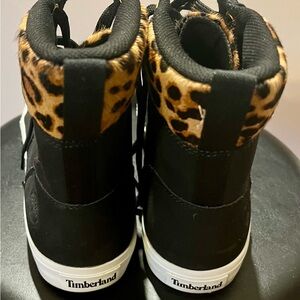 Size U.S. 9 black Timberland high-top sneakers featuring eye-catching leopard print accents. Like New.