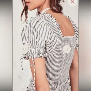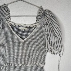 The Thea Dress, in custom yarn-dyed striped cotton, has a v-neck framed by puffed sleeves with encased elastic openings. The bodice and top half of the skirt are comprised of fan favorite smocking with shirred ruffle details. At the lower hip, the fitted skirt flares into a gathered panel with ruffle trim. Shown here in Cotton.