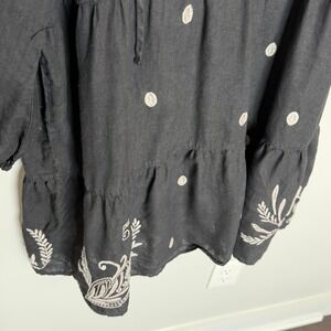 Johnny Was black linen embroidered tunic dress blends bohemian elegance with a relaxed silhouette. This tiered piece features intricate white floral and vine embroidery across the front, back, and sleeves, highlighted by a majestic bird motif on the reverse. Designed with a ruffled split neckline, tassel tie closures, and elasticized cuffs, it offers a comfortable yet sophisticated look.