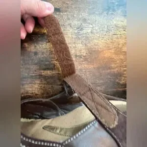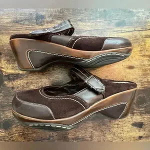 Womens Rialto comfort slip on/slide wedge style clog. Rubber soles. The shoe is leather & suede construction. The interior of the shoe has some cracking but the exterior is in near perfect condition. There are 2- adjustable Velcro straps, across the foot.