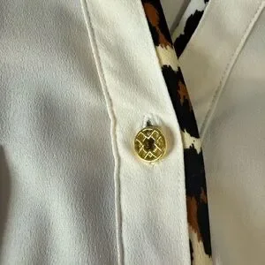 Off-White Button-Up Blouse with Leopard Print Trim and gold details.