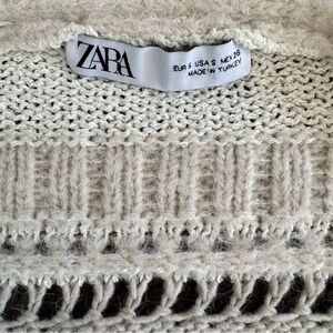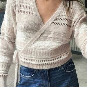 Soft, cropped wrap cardigan sweater in beige and cream stripes from Zara. Features an open knit design with a side tie closure and long sleeves.