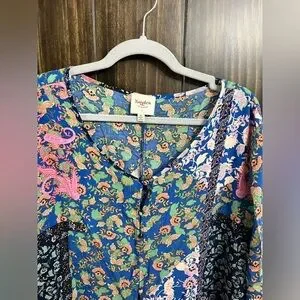 ▪️Women’s duster shrug topper. Upper button front closure, Bohemian style floral pattern, side slits, and 3/4 bell sleeves. Pre-owned. Wear it with your favorite outfit!