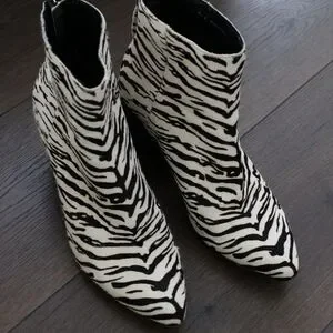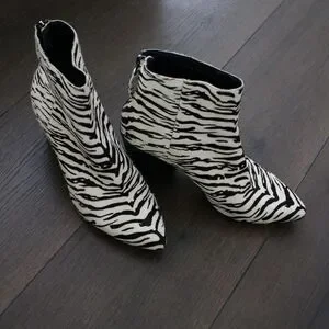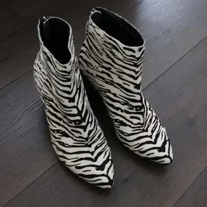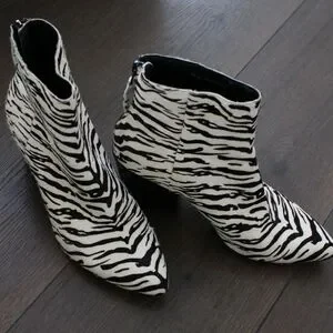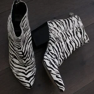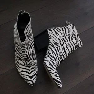 Stylish zebra print ankle boots with a bold black and white pattern. Perfect for adding a statement to any outfit.